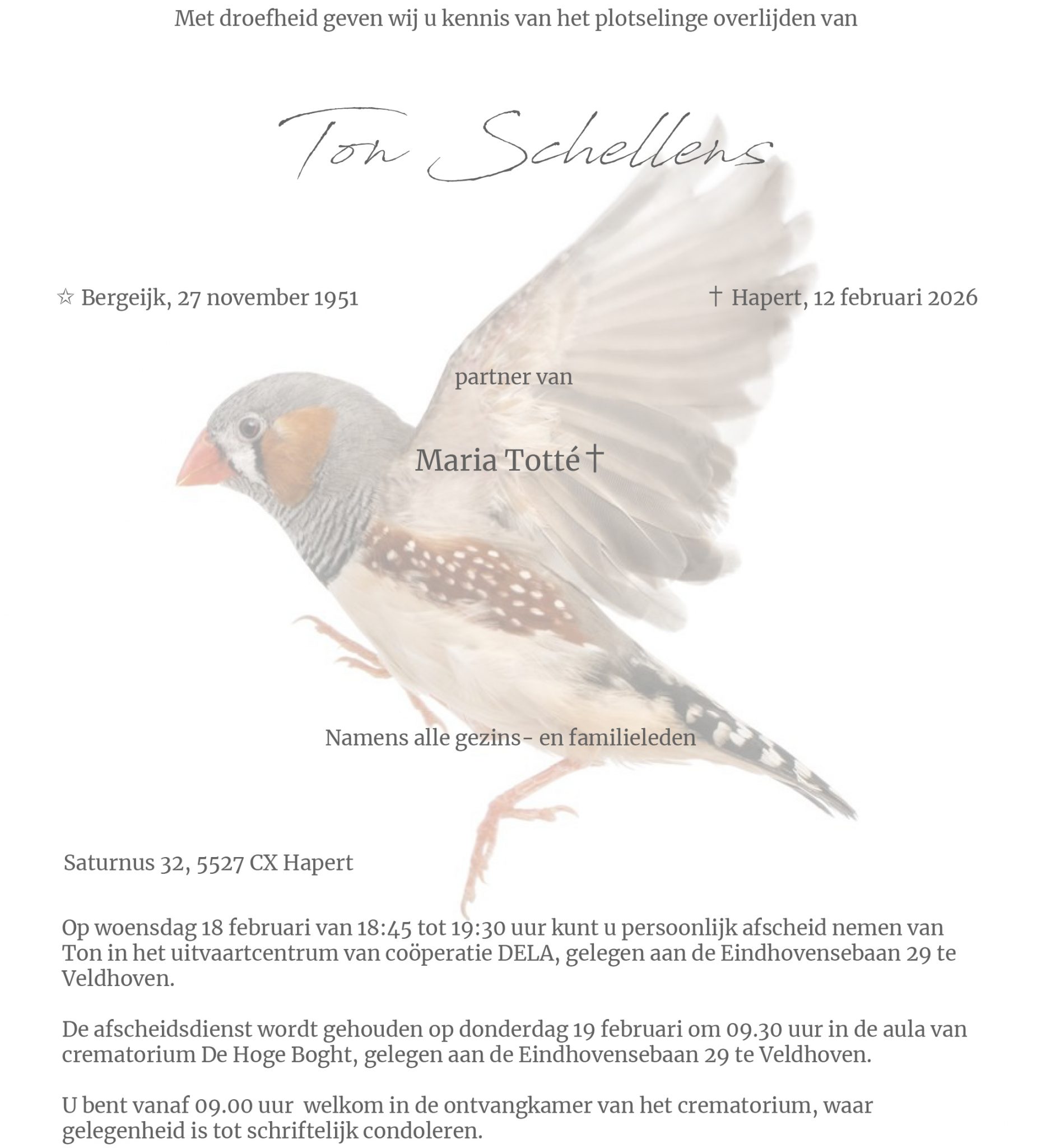Terlo stelt haar leden op de hoogte van het overlijden van jarenlang lid Ton Schellens en biedt de familie haar condoleances aan.